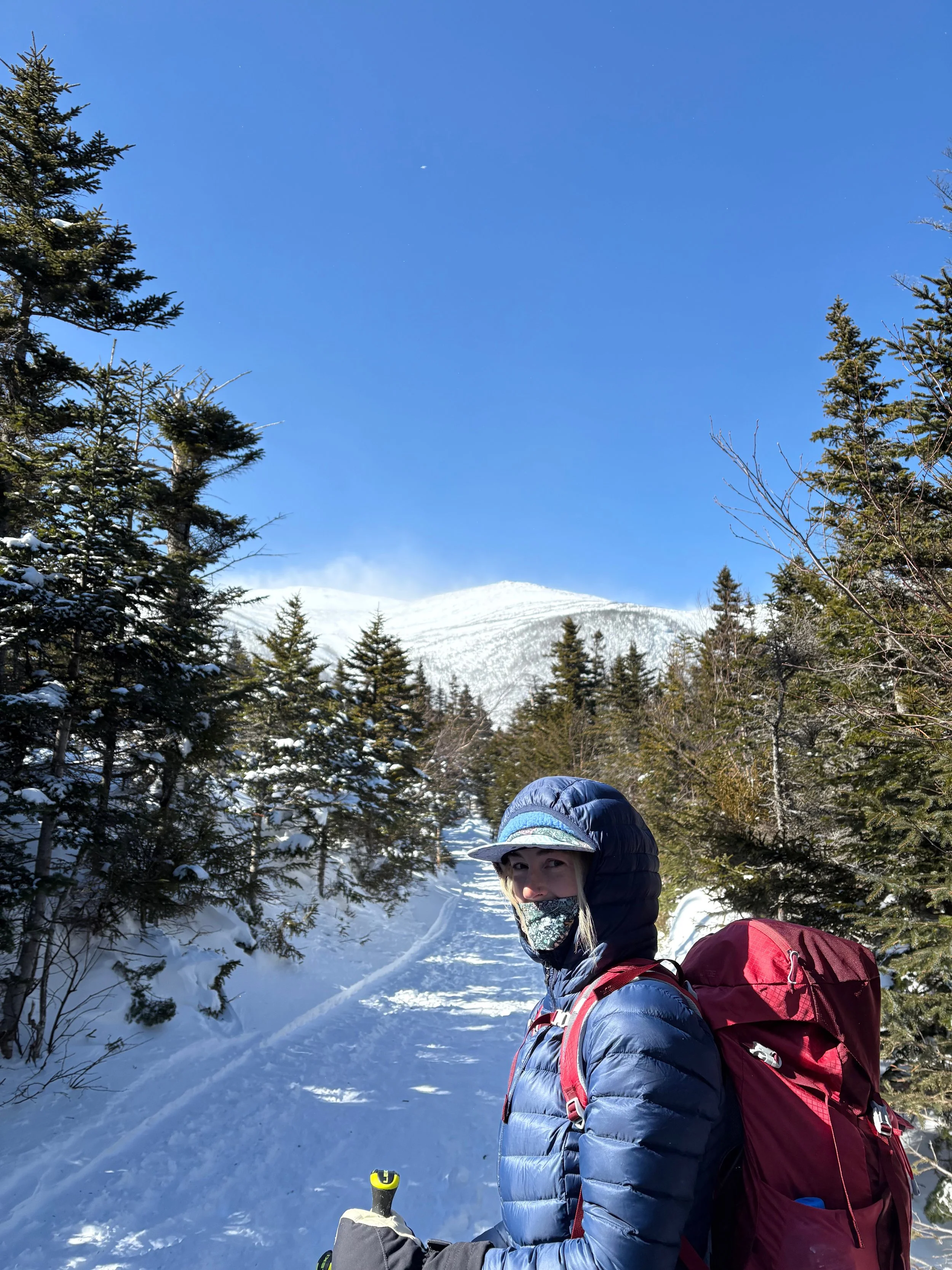Sam grew up skiing casually but fell in love with uphill touring in 2020 when her best friend Kelsey introduced her to the backcountry. After four years in Boston, she moved to New Hampshire in 2022 to be closer to the mountains and started volunteering with Inclusive Ski Touring during the 22/23 season. Now based in Gorham, NH with her partner Stuart and their pup Scarlett, Sam spends her free time hosting “SalmonStew Trivia” across Mt. Washington Valley and Coös County, serving on the Gorham Destination Management Committee, and volunteering with Summits in Solidarity to support racial justice and equity in outdoor spaces.